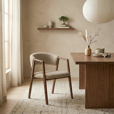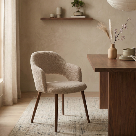 79,95Eenheid prijs /Niet beschikbaarJapandi eetkamerstoel zandkleur bouclé Aki - walnoot frame - met armleuning