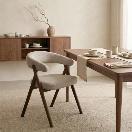 89,95Eenheid prijs /Niet beschikbaarEetkamerstoel bouclé zandkleur Jiro - walnootlook frame - Japandi