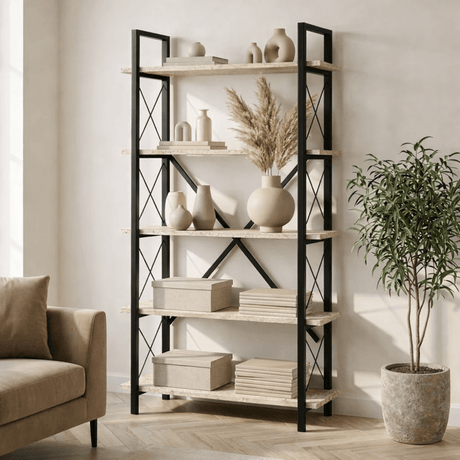 149,95Eenheid prijs /Niet beschikbaarIndustriële Boekenkast Ely Travertin Melamine - Zwart Frame - 180x90 cm