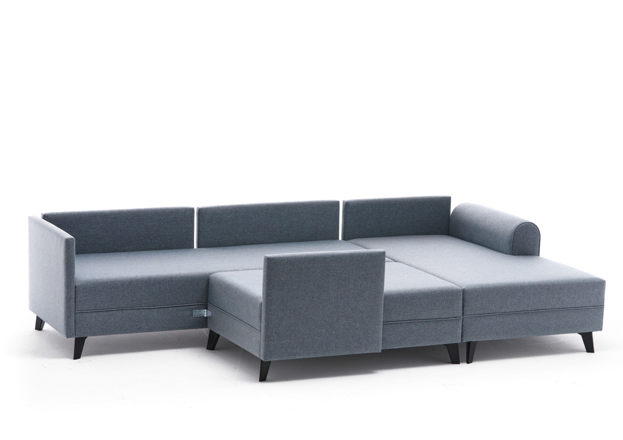 Grâce à son design d'angle intelligent, ce canapé-lit se transforme sans effort en un lit spacieux, offrant ainsi un refuge douillet pour vos invités ou un havre de paix pour vous-même. La taille généreuse du lit de 219 x 149 cm offre suffisamment d'espace pour une bonne nuit de sommeil.