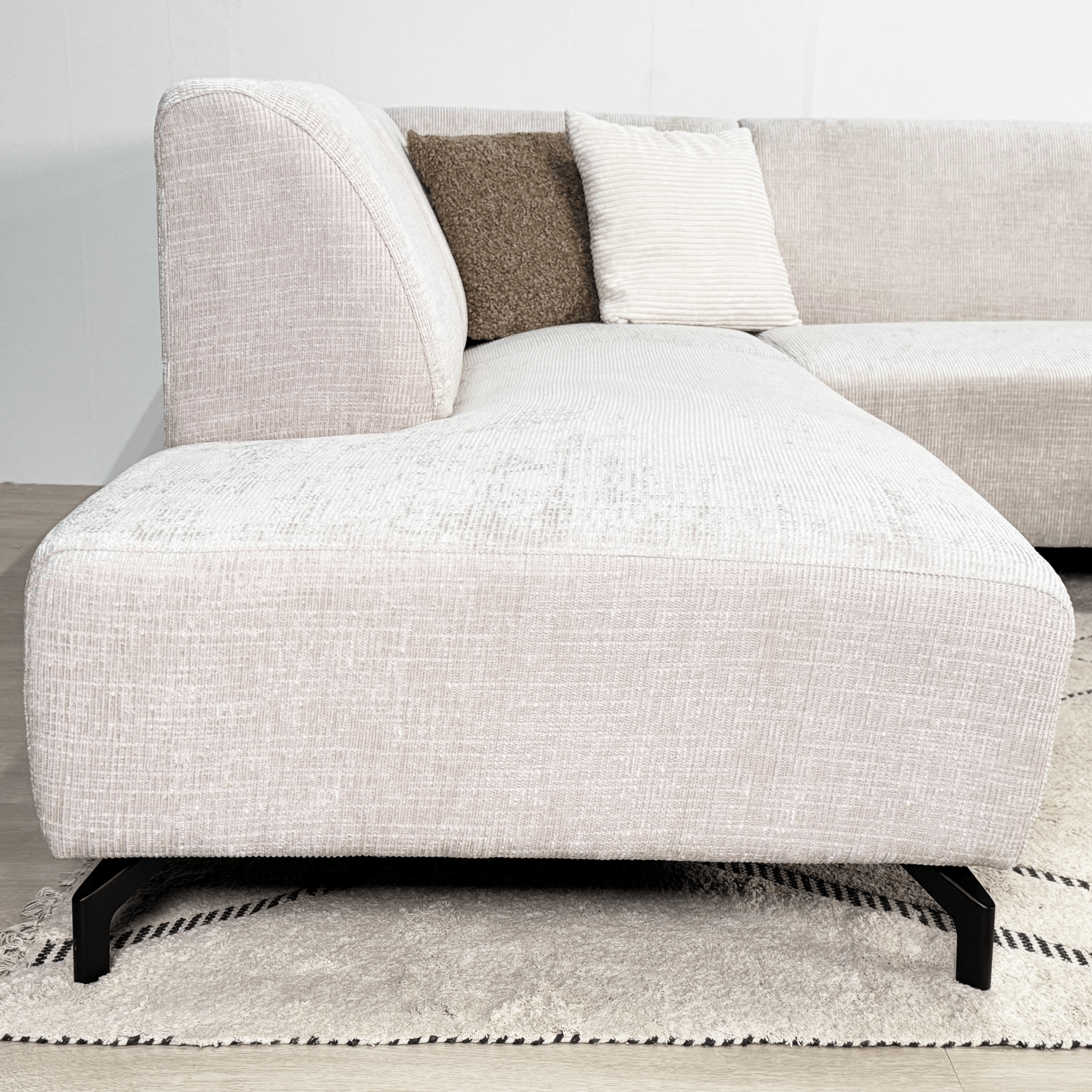 Le canapé d'angle Manon a un design épuré et moderne avec une apparence robuste et solide. Les coussins fixes assurent un look épuré et offrent un confort constant. Les coussins fixes sont soigneusement conçus pour offrir un soutien optimal, sans compromettre le confort d'assise. Les pieds en métal fins ajoutent une touche industrielle, donnant au canapé une touche contemporaine. Les pieds en métal sont solides et durables, ce qui contribue non seulement à la stabilité du canapé, mais aussi à son apparence moderne.