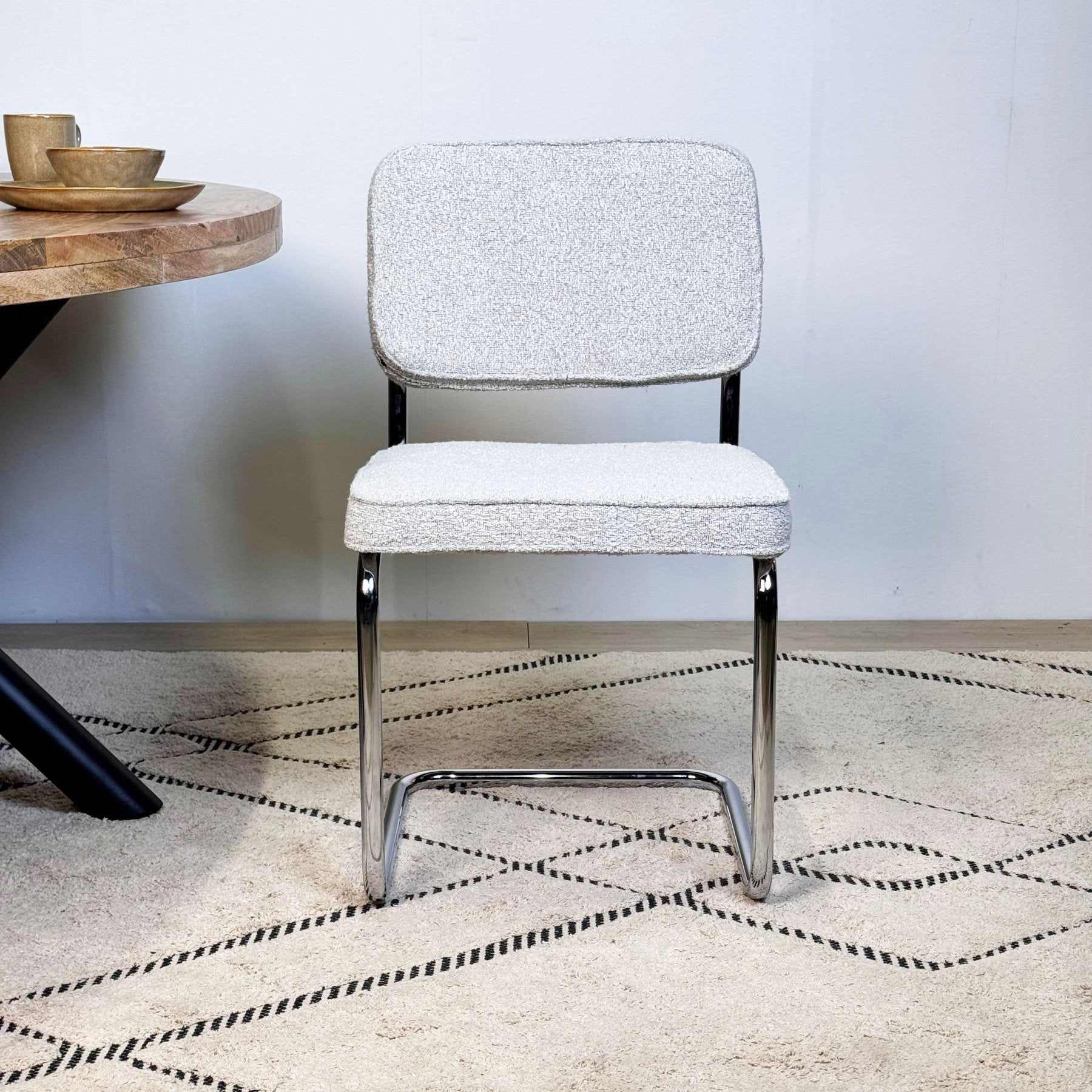 La chaise de salle à manger Sway combine un cadre en chrome élégant avec un tissu bouclé doux, ce qui lui confère une allure contemporaine dans chaque salle à manger ou cuisine. Disponible en plusieurs couleurs, cette chaise de salle à manger moderne s'adapte parfaitement à divers styles d'intérieur, du scandinave au rétro, en passant par l'industriel.
