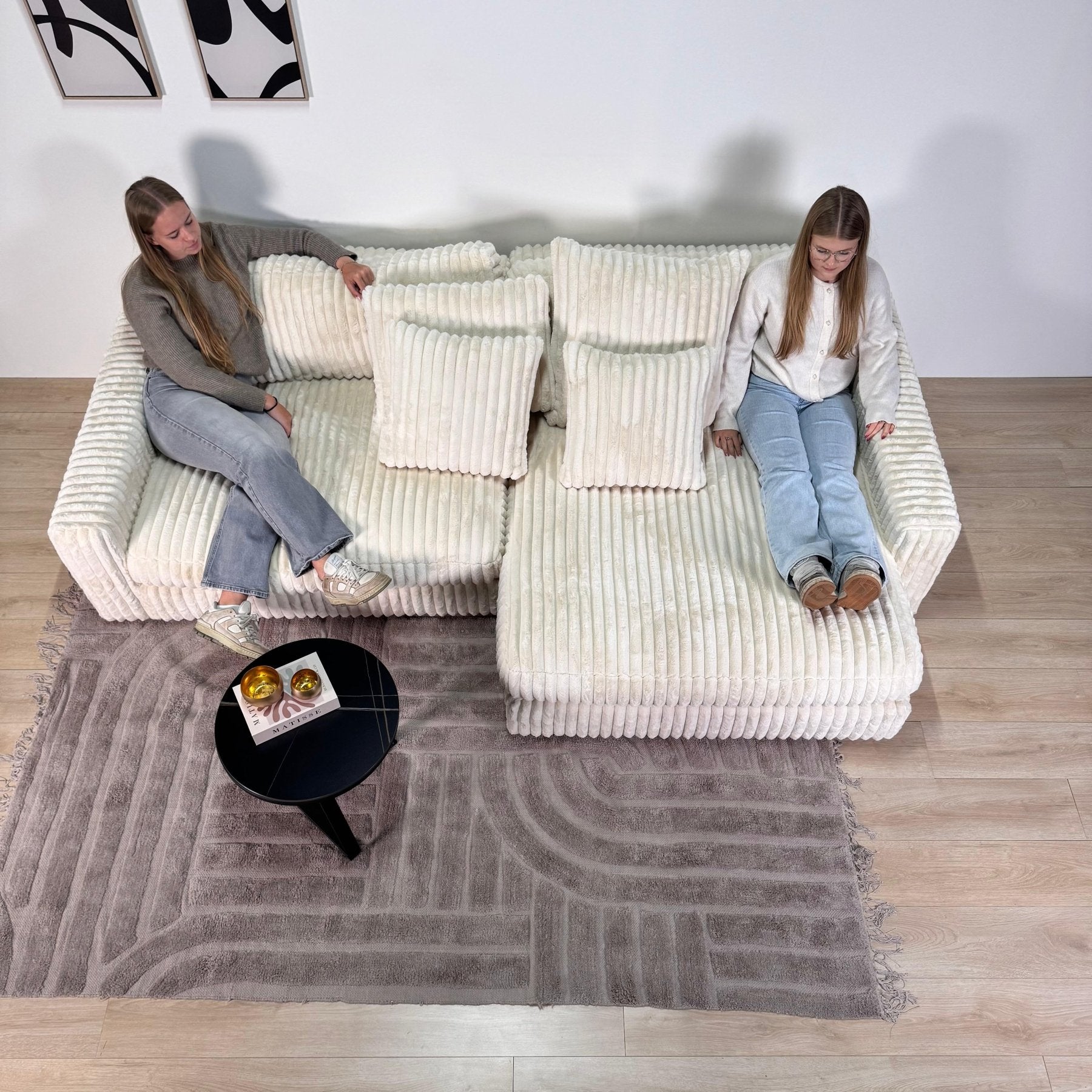 Le canapé est recouvert d'un velours côtelé très large dans un style scandinave moderne et doux. La couleur beige clair donne une apparence fraîche à chaque pièce, mais gardez à l'esprit que cette couleur peut être un peu plus sensible aux taches. C'est pourquoi nous vous conseillons d'acheter le kit d'assurance contre les taches iProteqt.