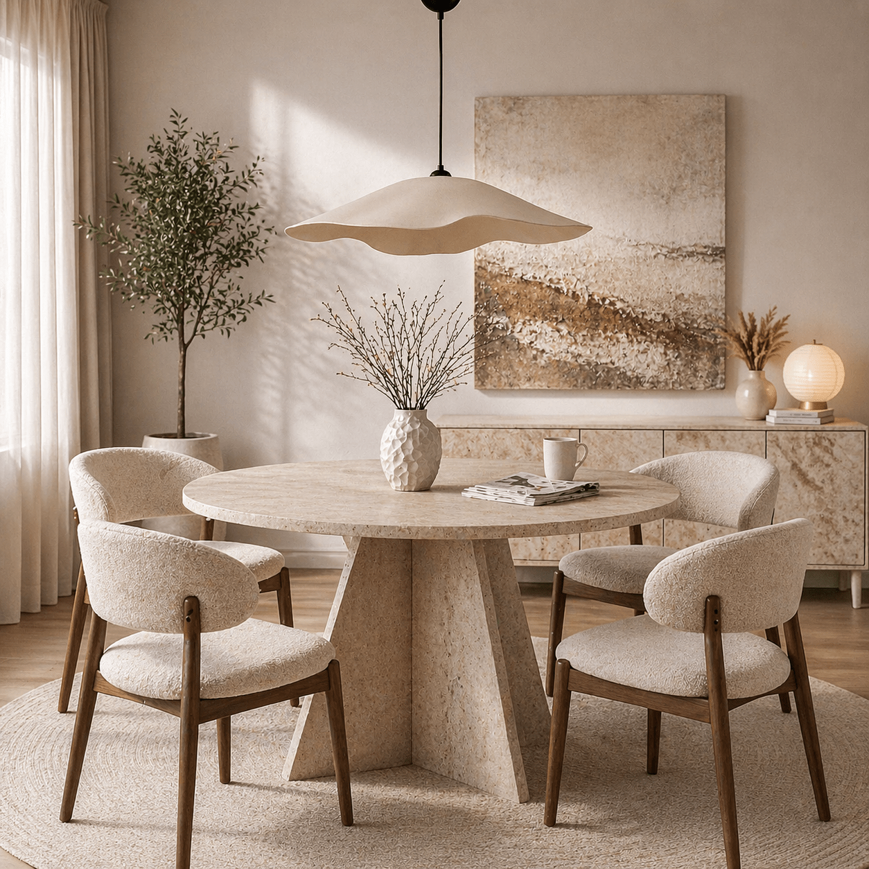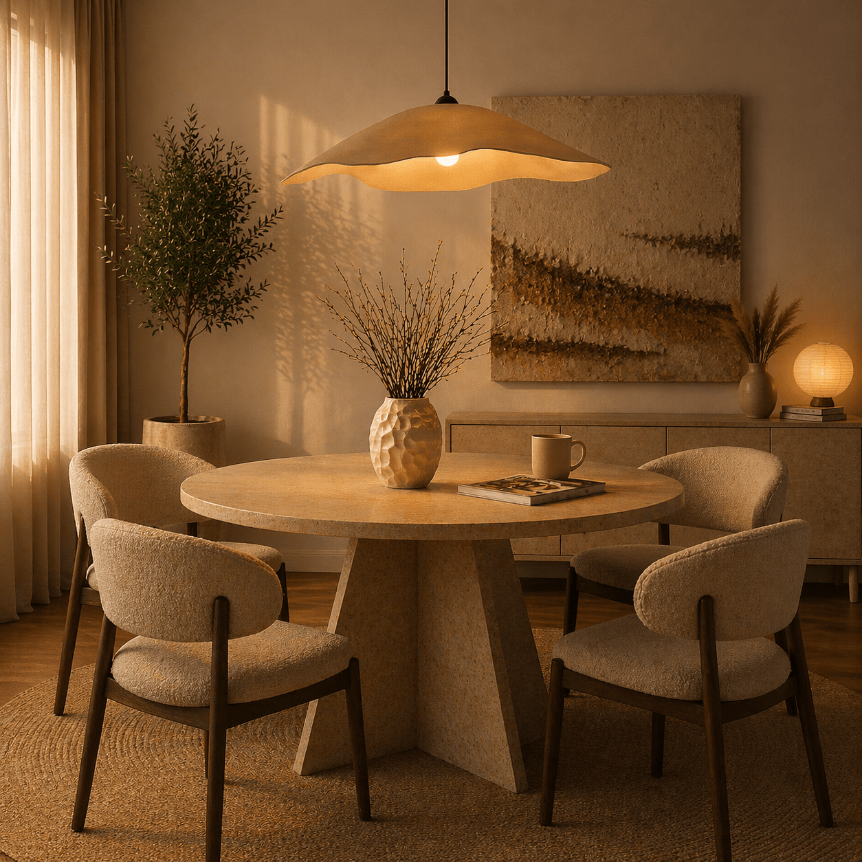 La combinaison de couleurs crème douces et de tons dorés chauds crée une atmosphère raffinée et paisible. L'abat-jour en béton de carbone ajoute une touche moderne, faisant de cette lampe un choix parfait pour les intérieurs contemporains et classiques.