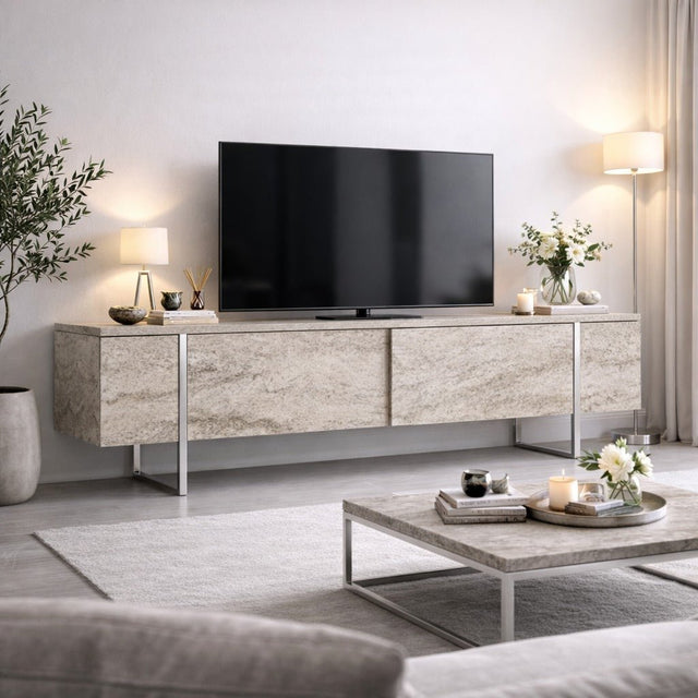 Meuble TV Travertin Luxe 180x50x30 - Cadre Argenté