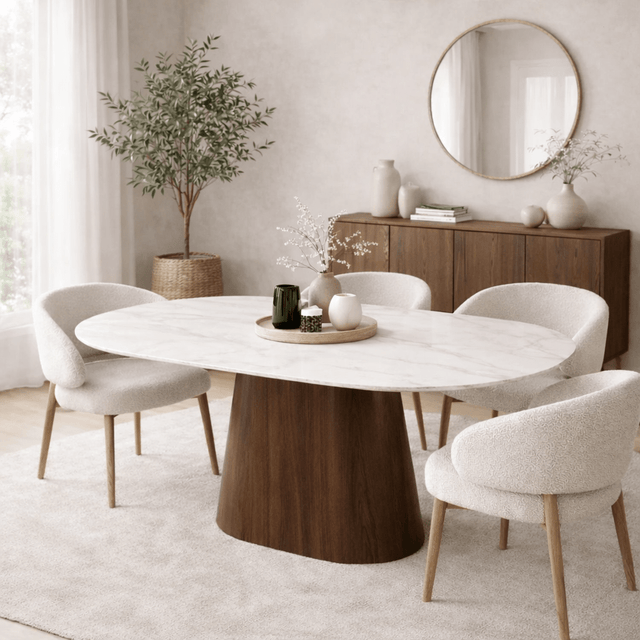 Table à manger en pierre frittée look marbre Travertin Lea 180x90 cm - Cadre en noyer - Ovale danois
