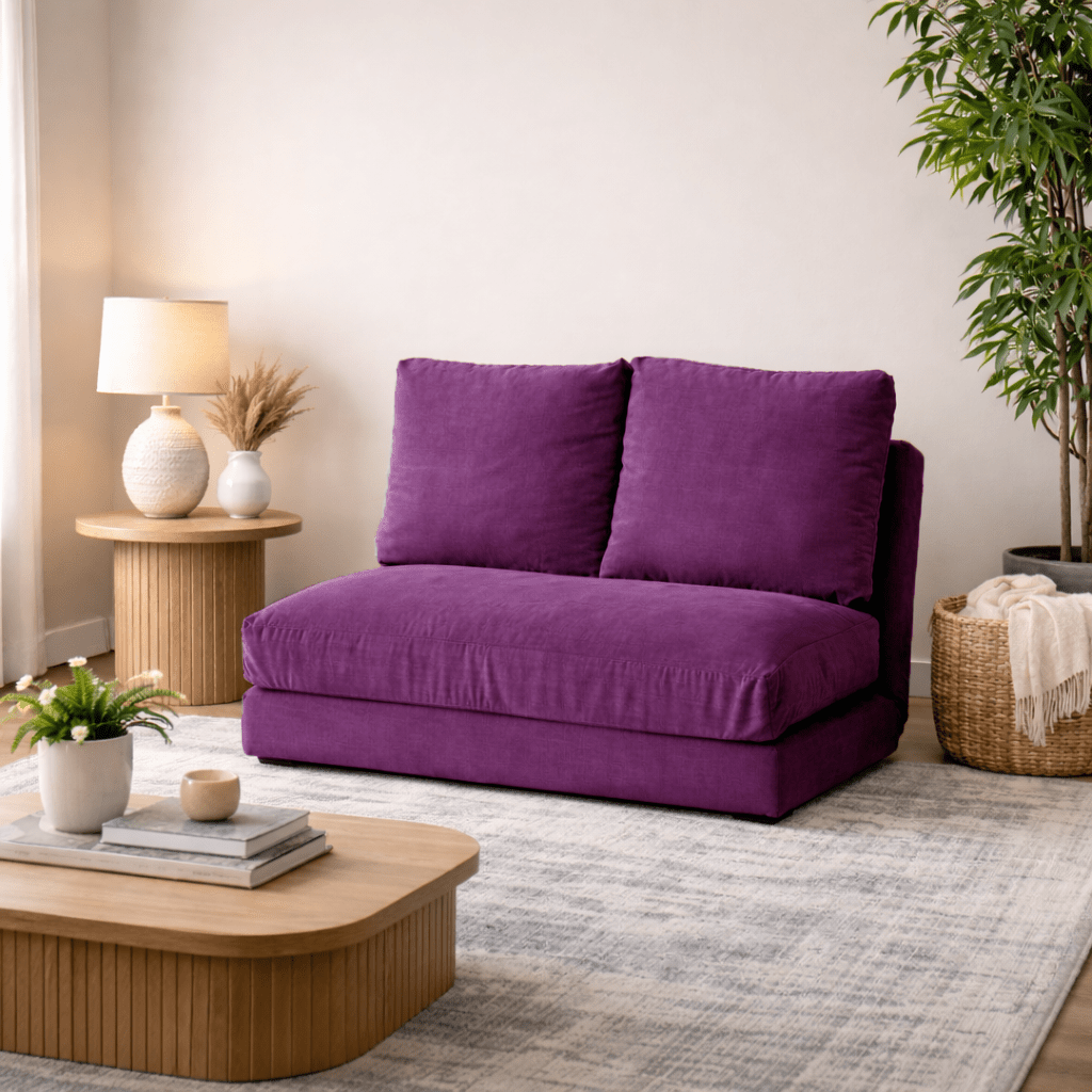 Beschrijving en specificaties van Slaapbank Japandi paarse stof 2-zits - lage rug en verstelbaar - Taida