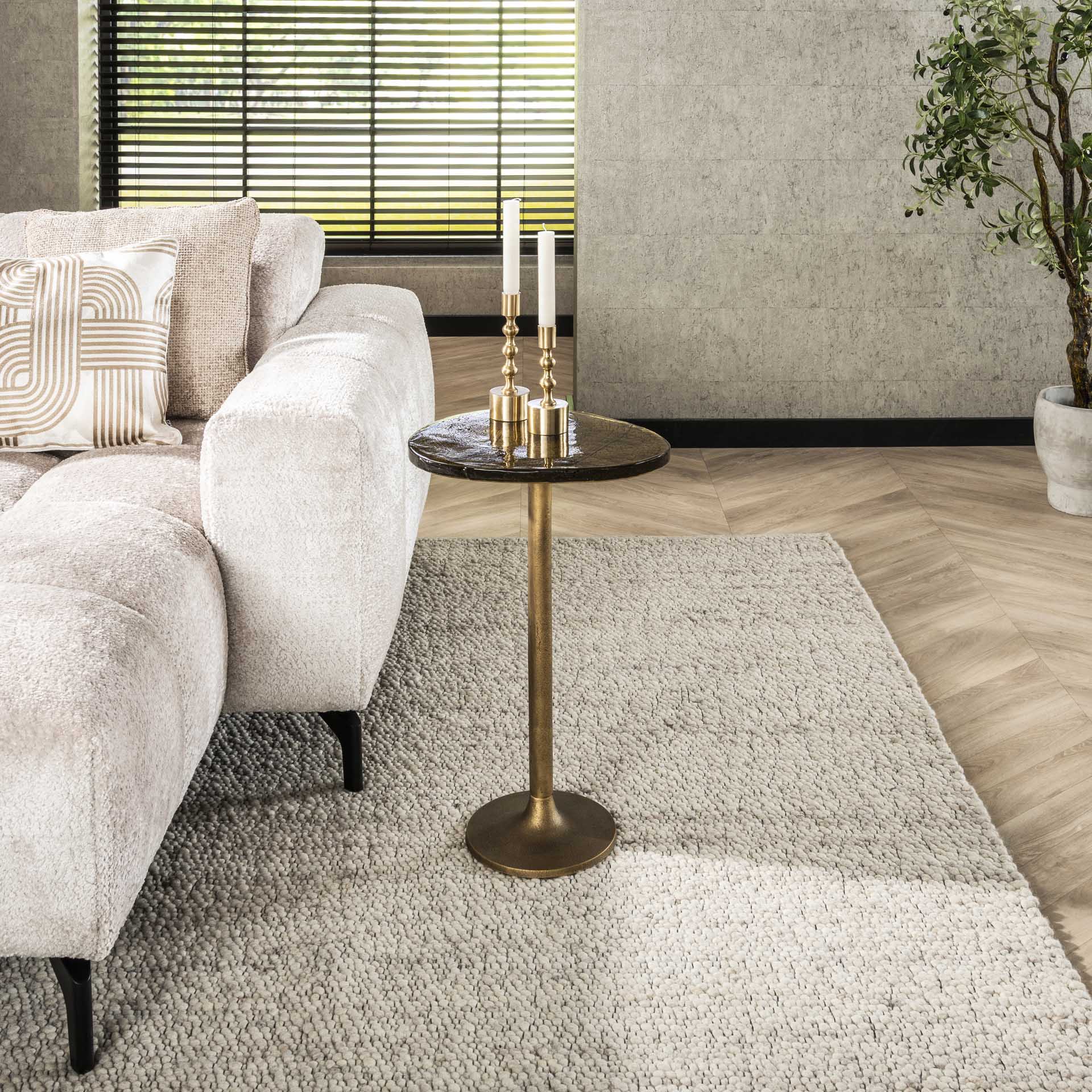 Maak je zithoek compleet met bijzettafel Aurum. De warme antiek gouden finish geeft elk interieur een luxe touch, terwijl het slanke silhouet weinig ruimte inneemt. Perfect naast de bank, als plantentafel of om je favoriete woonaccessoires te showen. Dankzij de compacte vorm schuif je Aurum eenvoudig waar extra stijl en functionaliteit nodig is.