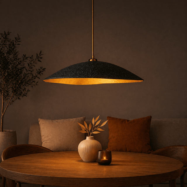 Geef je interieur direct een stijlvolle upgrade met deze zwart-gouden hanglamp. De combinatie van strak design en warme accenten zorgt voor een elegante uitstraling die in elke ruimte tot zijn recht komt. De carbonbeton afwerking geeft de lamp een stoere, industriële twist met een luxe randje.