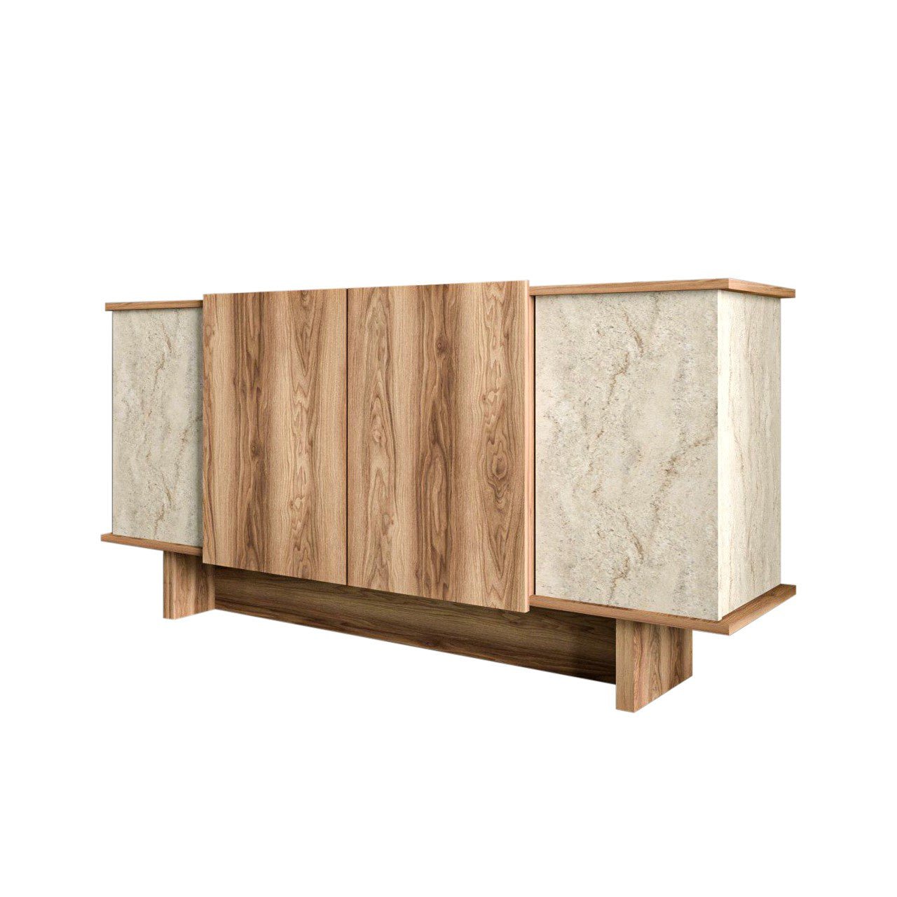 De combinatie van travertinlook met walnootkleur zorgt voor een chique, hotelwaardige uitstraling die toch toegankelijk aanvoelt. De lichte steenlook brengt frisheid en ruimte, terwijl de warme houttint diepte en gezelligheid toevoegt. Door het tijdloze ontwerp past dit dressoir moeiteloos in moderne, Scandinavische en Japandi interieurs, maar ook in een warm klassiek geheel. De vele vakken geven het meubel een luchtige, geordende look.