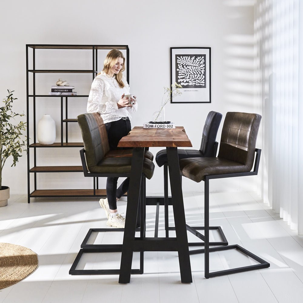 Bartafel Quinty is een robuuste bartafel gemaakt van mangohout. Een zeer stijlvolle en praktische bartafel in iedere keuken of woonkamer. De A-vormige, metalen poten geven de tafel veel stabiliteit en dragen bij aan de industriële stijl.