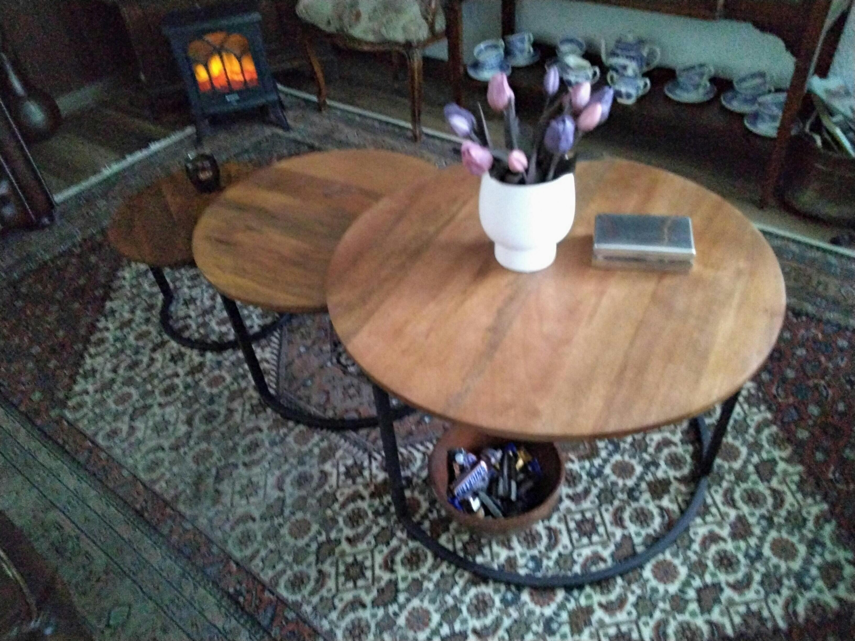Voor de genoemde prijs krijg jij niet één, niet twee, maar zelfs drie tafeltjes! Door de verschillende afmetingen kunnen de tafels onder elkaar geschoven worden, dit geeft meer ruimte in de kamer als de tafels niet gebruikt worden. Om meer . tafelruimte te creëren plaats je de tafeltjes juist uit elkaar, of zelfs elk in een andere hoek van de kamer. Dit zorgt voor eenheid in het interieur en een speels effect.
