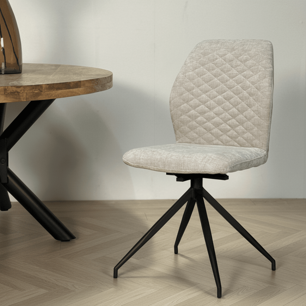 Draaibare eetkamerstoel Charly geeft jouw eetkamer een stijlvolle, luxe en modern chique uitstraling. De zachte maar stevige stof voelt super zacht aan en heeft een lichte glans.