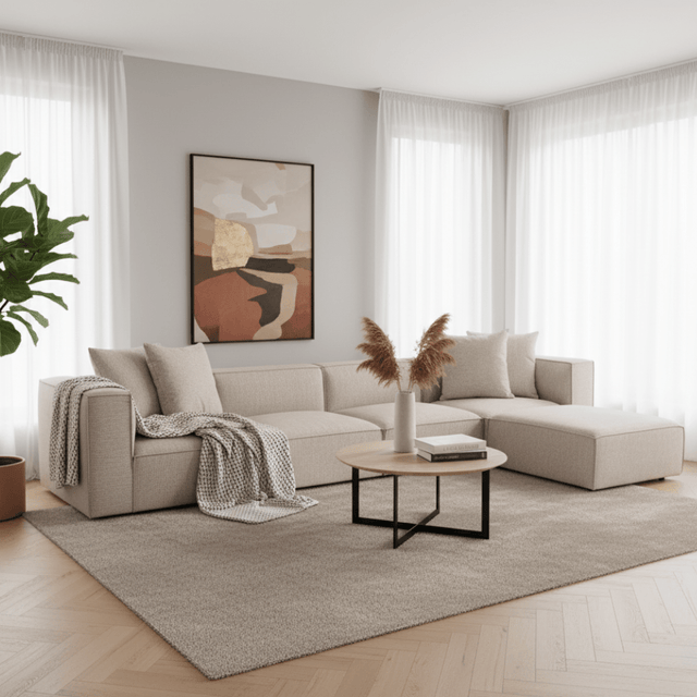 Met zijn strakke en eigentijdse ontwerp past onze hoekbank moeiteloos bij elke interieurstijl. De zandbeige kleur voegt een vleugje verfijning toe aan je woonruimte, terwijl de 100% linnen stof een gevoel van luxe uitstraalt. De strakke lijnen en het moderne silhouet maken van deze bank een pronkstuk dat de algehele esthetiek van uw huis zal verbeteren.