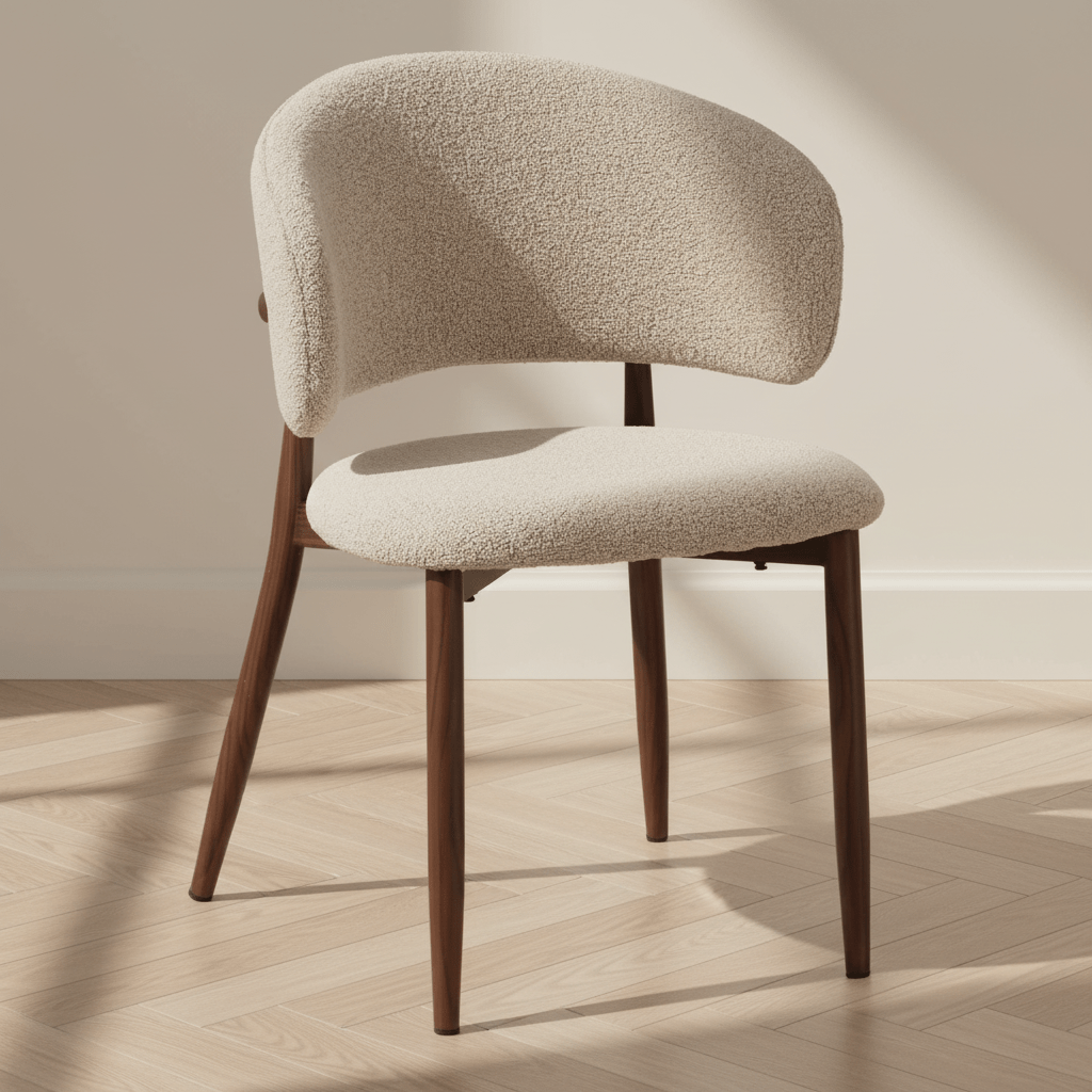 De Yuka eetkamerstoel is bekleed met een luxe bouclé stof, bekend om haar warme, wollige uitstraling en zachte structuur. De poten zijn gemaakt van metaal en afgewerkt met een realistische walnoot houtlook, waardoor de stoel de perfecte balans biedt tussen stijl en stevigheid. De combinatie van zachte stof en natuurlijke tinten zorgt voor een tijdloze look.