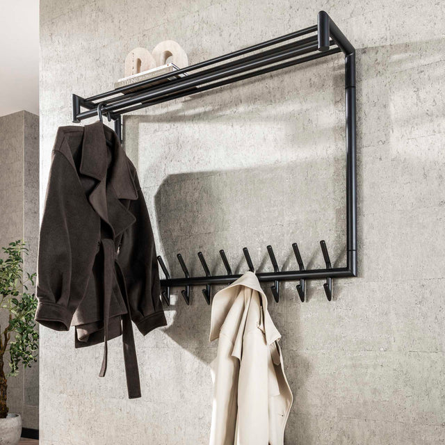 Kapstok Kym is de ideale oplossing voor wie op zoek is naar veel opbergruimte en een strak design. Deze ruime kapstok is uitgevoerd in donkergrijs mat gepoedercoat staal en opgebouwd uit ronde buizen. De hoedenplank, bestaande uit meerdere stevige buizen, biedt extra ruimte voor het opbergen van hoeden, tassen en andere accessoires.