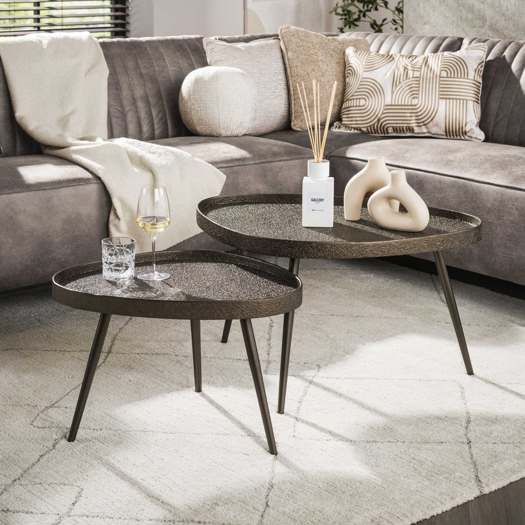 De Contour driehoekige salontafel set van 2 brengt een opvallende, sculpturale touch naar je woonkamer. Deze set bestaat uit twee driehoekige bijzettafels uitgevoerd in brons liquid metal met een verfijnde, licht gereflecteerde afwerking. Het ontwerp is gericht op functie en esthetiek: door het driehoekige silhouet passen de tafels zowel solo als gecombineerd bij moderne én industriële interieurs.
