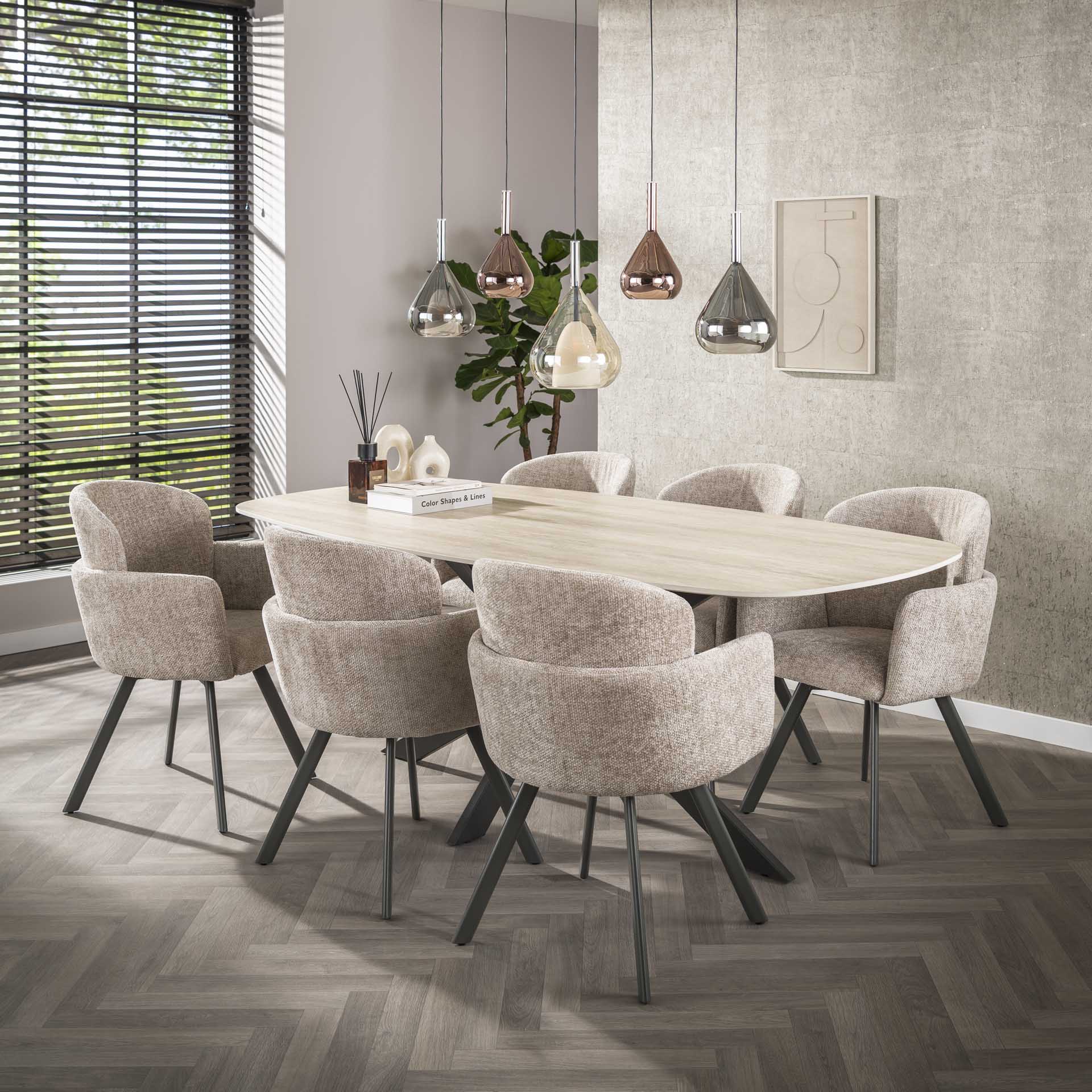 De Valente ovale eettafel combineert Scandinavische eenvoud met een luxe 3D keramiek travertine afwerking. Met een lengte van 215 cm en een diepte van 105 cm biedt deze tafel royaal plaats voor gezelschappen en is hij ideaal voor dagelijks gebruik en formele diners. Het keramische blad is slijt- en warmtebestendig, terwijl het subtiele travertine dessin een natuurlijke en tijdloze uitstraling geeft.