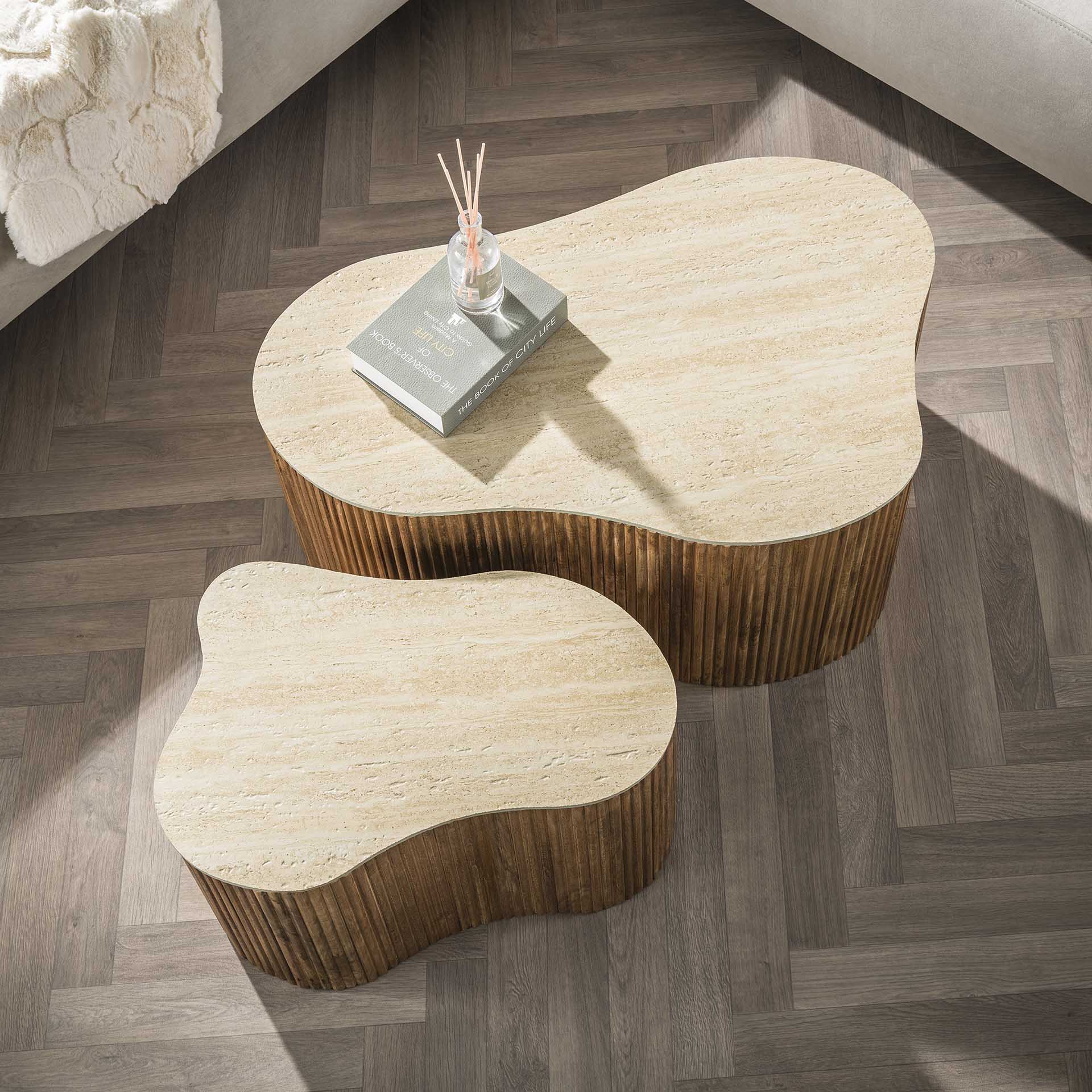 Vento Set van 2 organische salontafels zandkleur mangohout keramiek travertin
